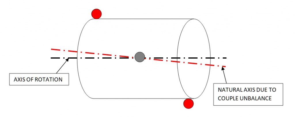 When mass distribution is such that the axis of rotation and principal axes intersect at the center of mass, this is a purely couple unbalance. This typically happens when the mass distribution is symmetric about the center of mass axially, but equal and opposite radially on either side of the center of mass.